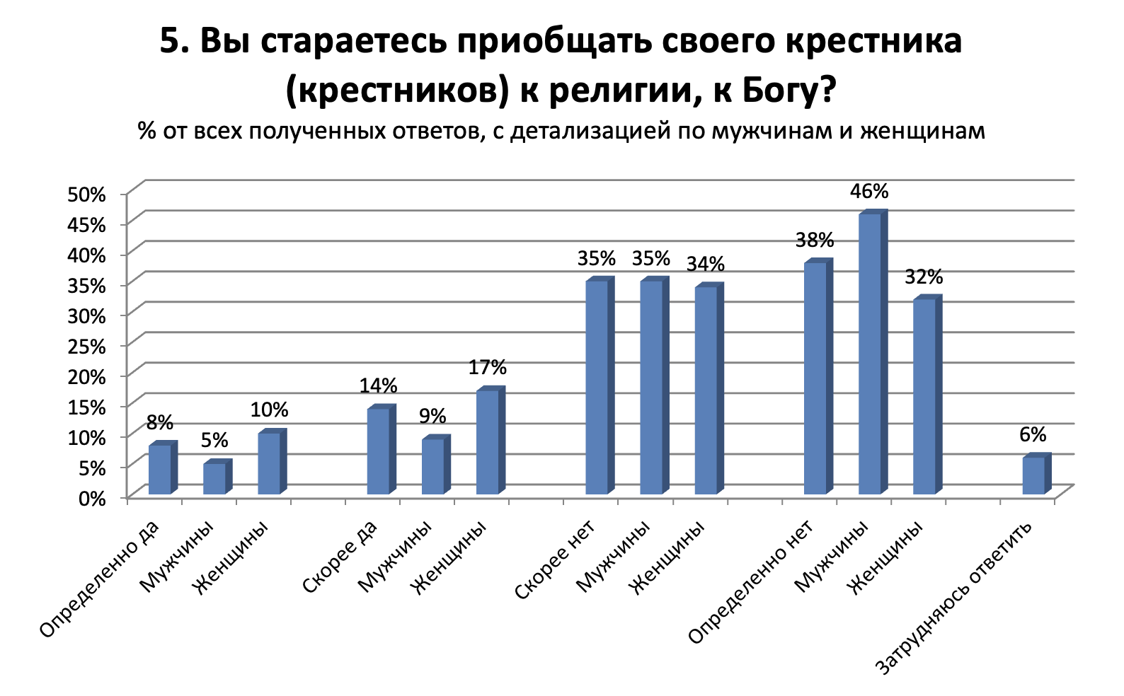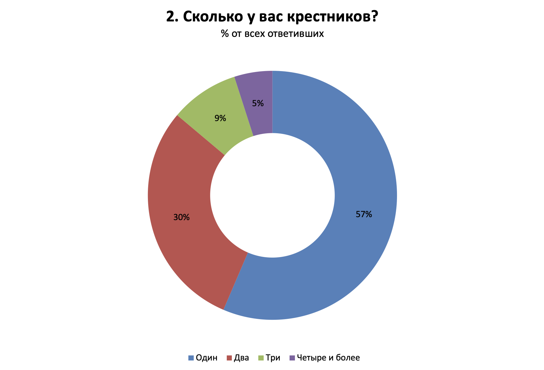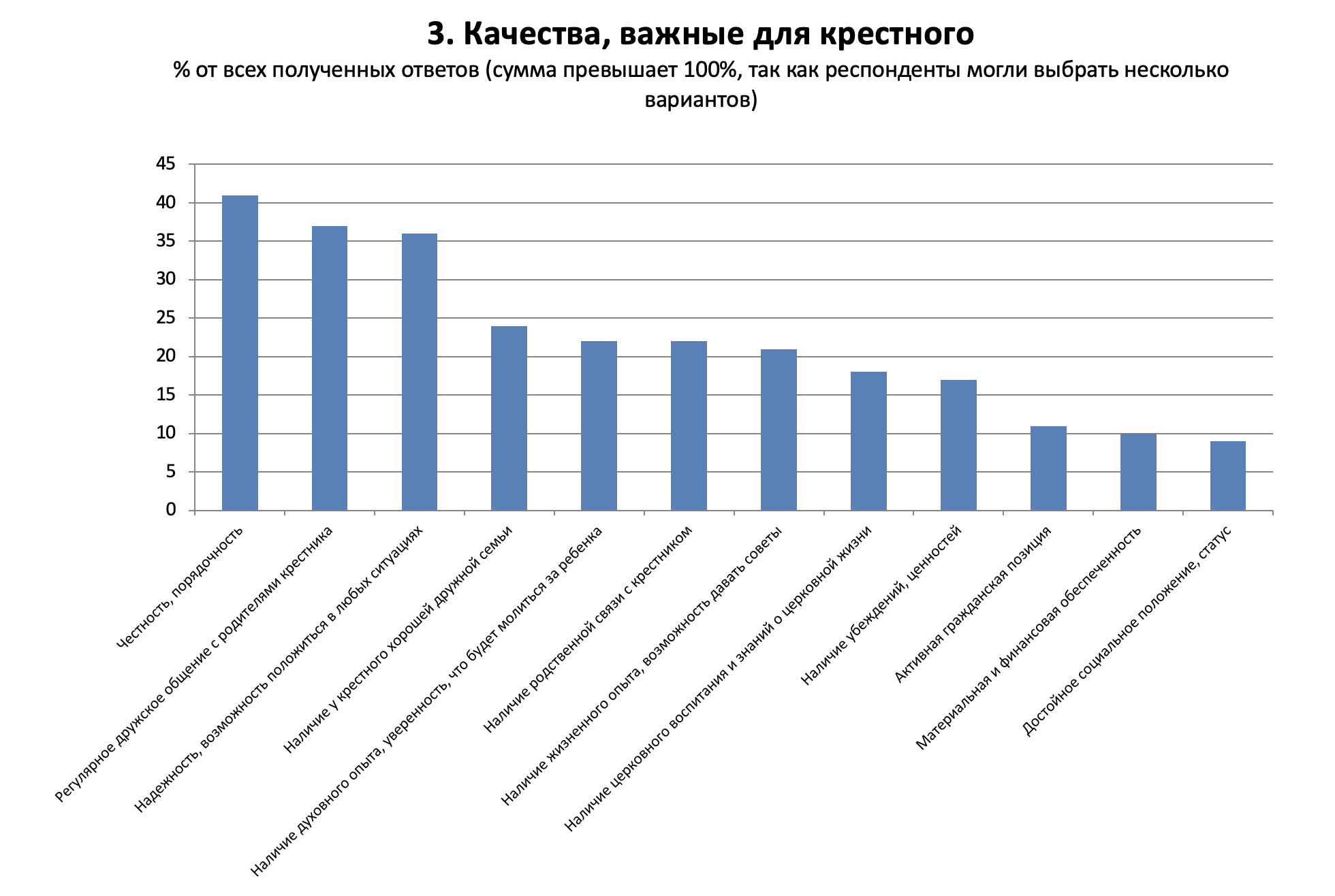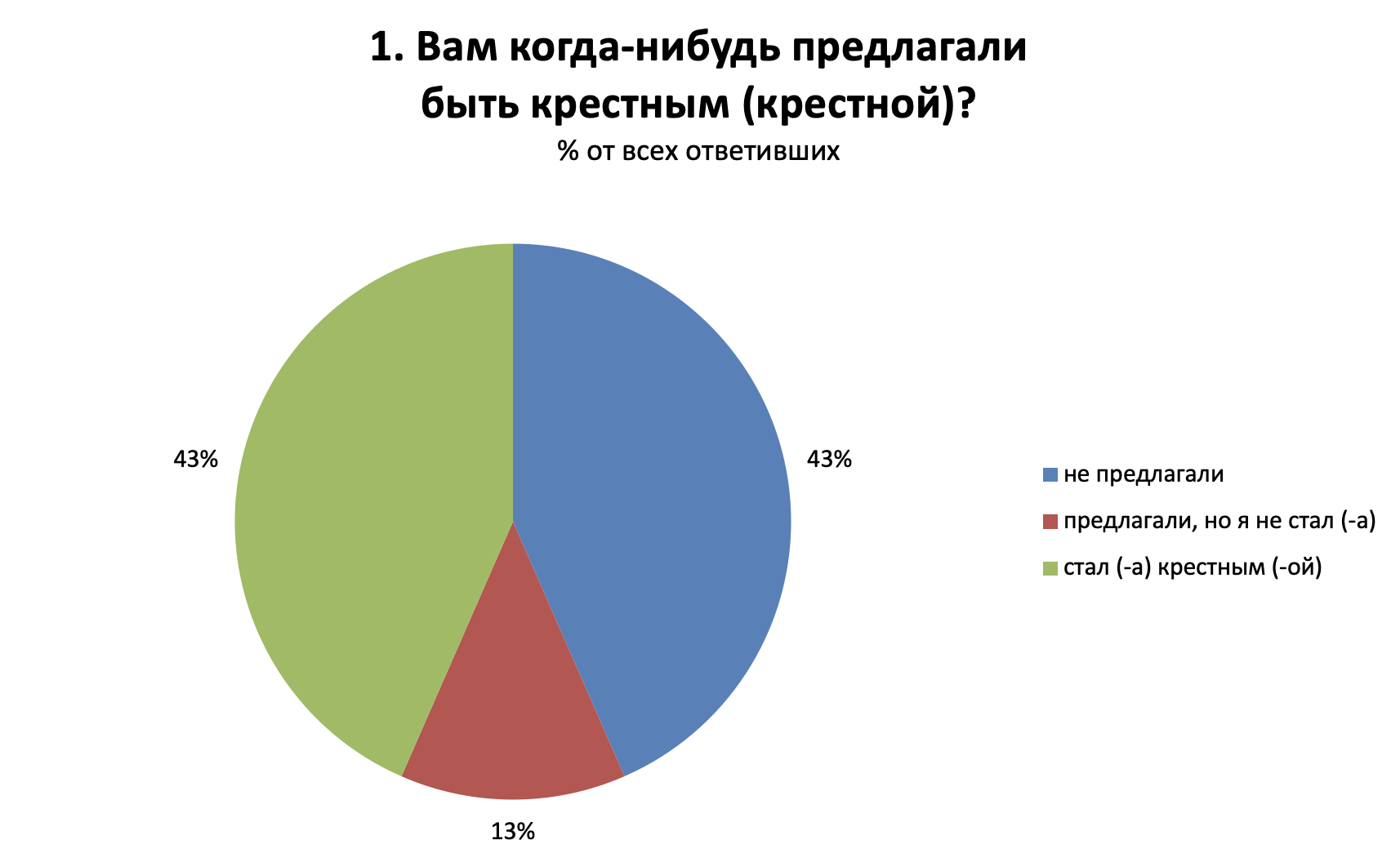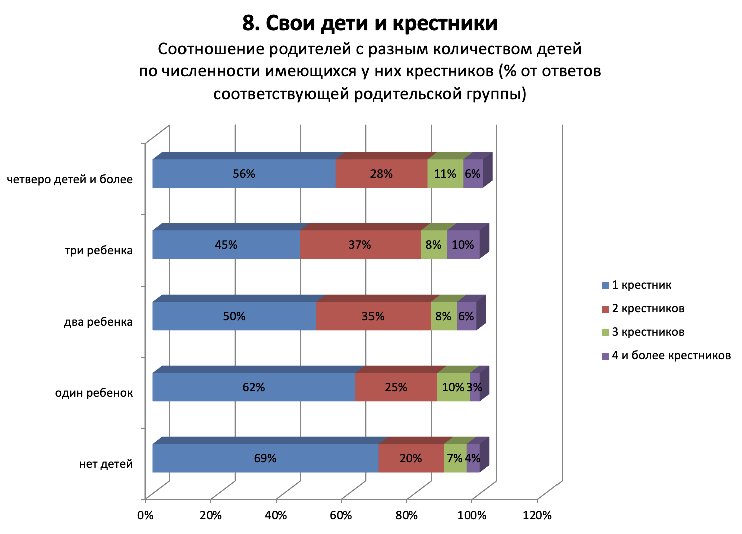 Лишь 13% из тех, кого звали в крестные, отказались от такого предложения. Более чем у 40% принявших это приглашение крестников двое или больше. Количество крестников предсказуемо больше у тех, кто был сам воспитан в религиозном духе и более воцерковлен.
