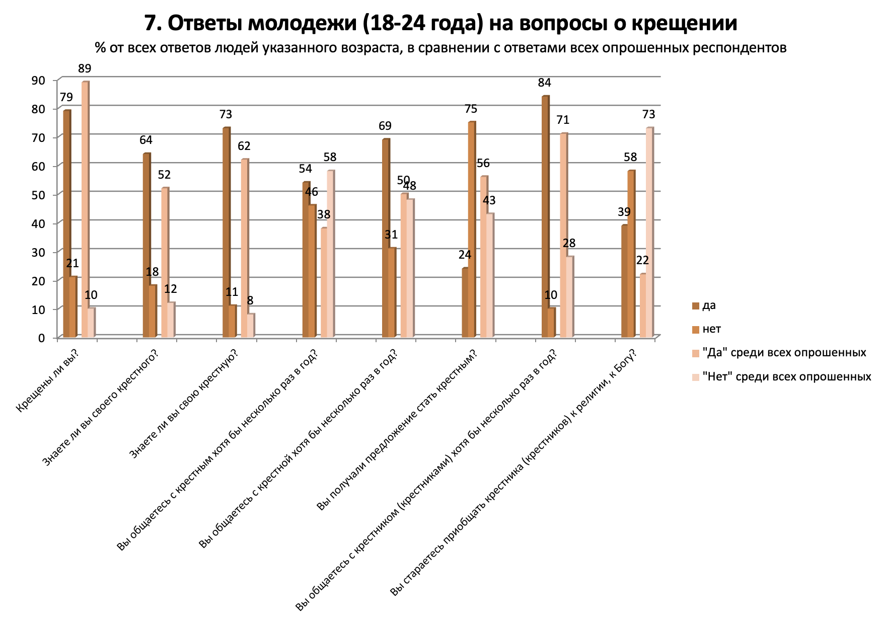 В то же время, из данных исследования можно сделать предположение, что введение в Русской Православной Церкви с конца 2011 года обязательной катехизации для людей, готовящихся стать крестными, крестить своих детей или креститься самостоятельно (с 12-летнего возраста), сыграло положительную роль. В большинстве случаев, когда речь заходила о крещении и христианской жизни в целом, молодые люди (18−24 года) демонстрировали более осознанное отношение и более активную позицию, чем респонденты среднего и старшего возраста. Как правило, у молодежи имеются оба крестных родителя, с которыми они поддерживают связь; они регулярнее общаются с крестниками и в большей степени осознают необходимость участвовать в их христианском воспитании. Интересно, что и отказываются от приглашений стать крестными молодые люди тоже сравнительно чаще: так поступили более 20% из них. Возможно, как раз потому, что осознают ответственность за крещаемых.